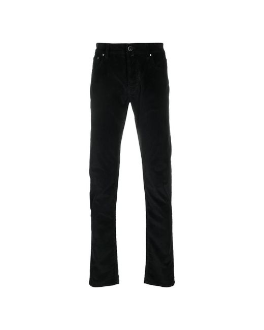 Elevate your style with the Jacob Cohén Bard Slim-Fit Trousers. Handmade in Italy, these trousers feature a unique blend of Japanese fabrics for a sophisticated look. Key attributes: Black | Corduroy | Five-pocket design | Logo embroidery on coin pocket | Mid rise | Belt loops | Dimensions & fit: Slim fit | Composition & care: 78% cotton | 20% modal | 2% elastane | Includes specific washing instructions.