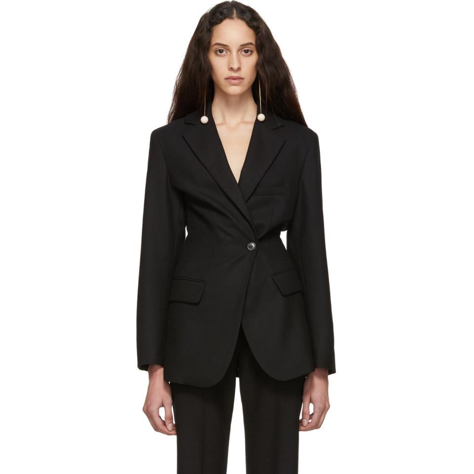 Long sleeve asymmetric wool blazer in black. Notched lapel collar. Single-button closure at front. Welt pocket at chest. Flap pockets at waist. Pleating at back. Tonal satin lining. Colour: black