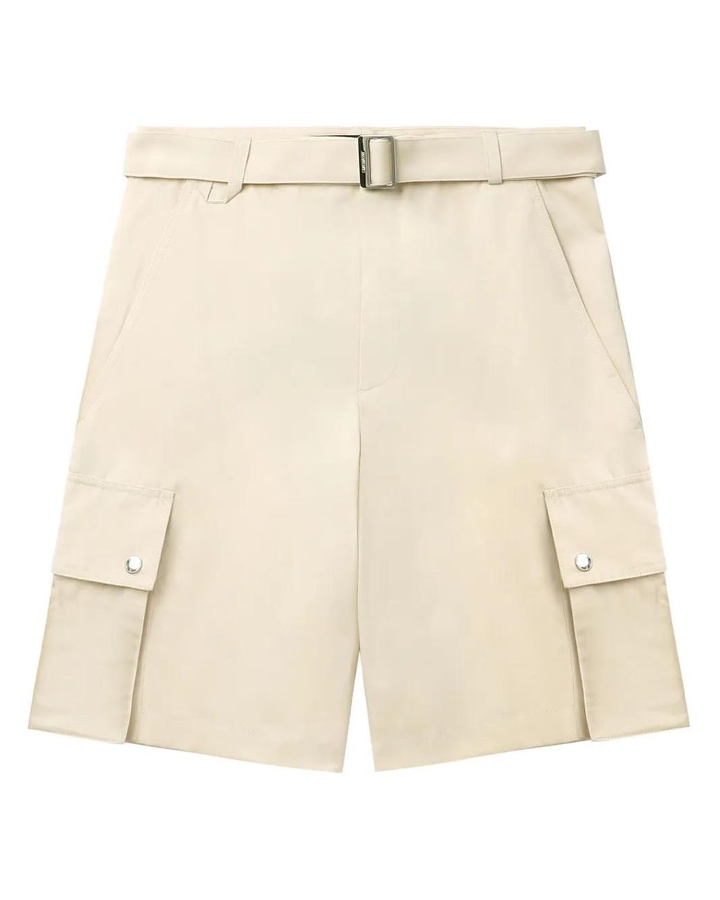 Light beige cotton-linen blend belt loops belted waist knee-length two side inset pockets two side cargo pockets rear stud-fastening pocket concealed front fastening Size: 44. Gender: Male. Material:Cotton/Flax.