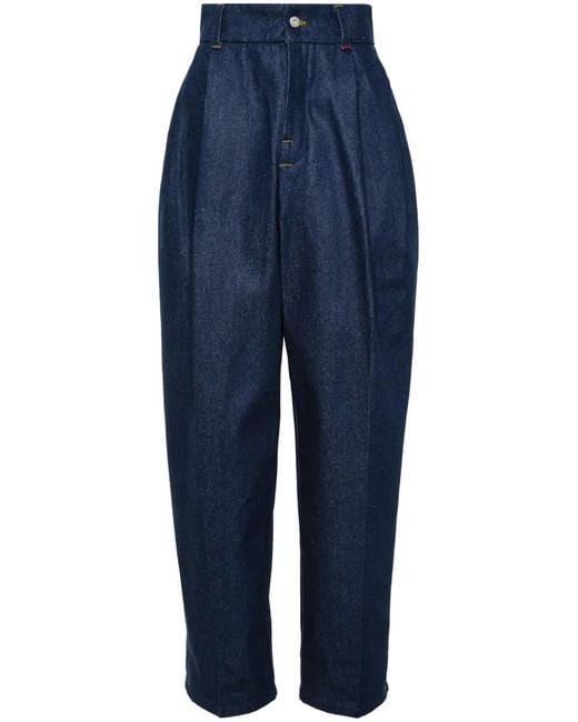 Indigo blue cotton denim button fly fastening belt loops pleat detailing two side inset pockets two rear patch pockets high-rise tapered leg Size: 24. Gender: Female. Material:Cotton.
