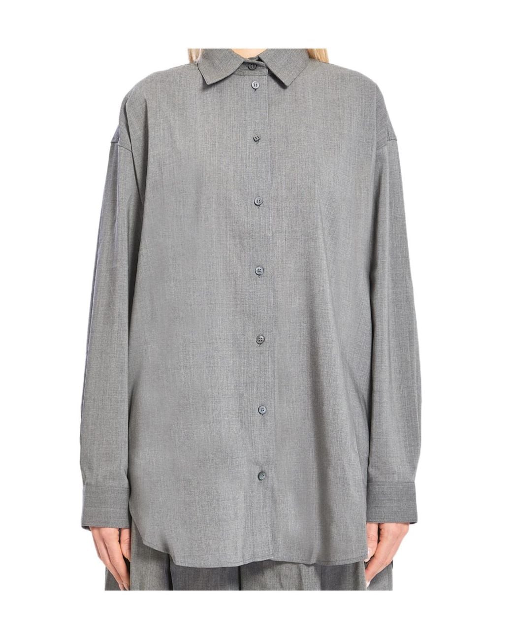 Front button closure, long sleeves with button cuffs and a slightly elongated curved back hem. Colour: grey