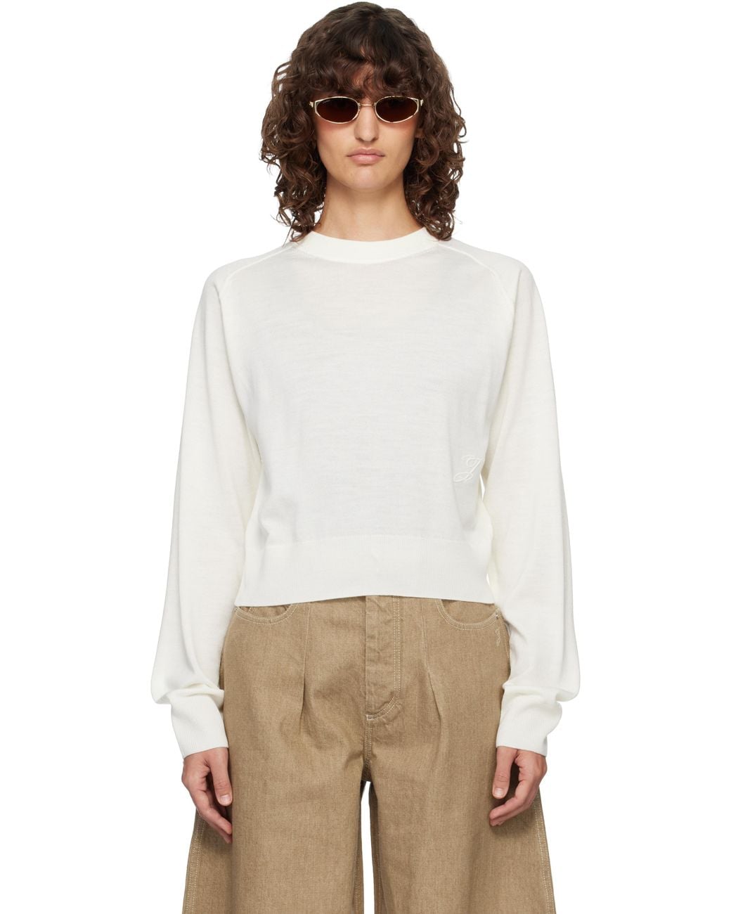 Knit merino wool-blend jumper. · Rib-knit crewneck, hem, and cuffs · Logo embroidered at front · Raglan sleeves Supplier color: Off white Colour: white
