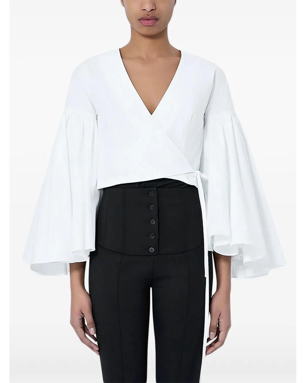 White cotton poplin texture V-neck flared sleeves wrap-around tie fastening cropped length Size: 32. Gender: Female. Material:Cotton.