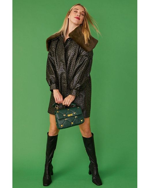 Women's Green Animal Print Coat With Oversized Faux Fur Collar Size: S