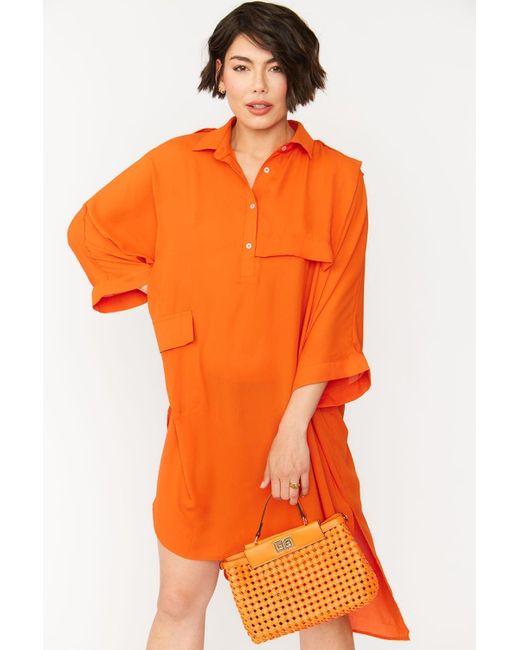 Women's Orange Silk Blend Shirt Dress