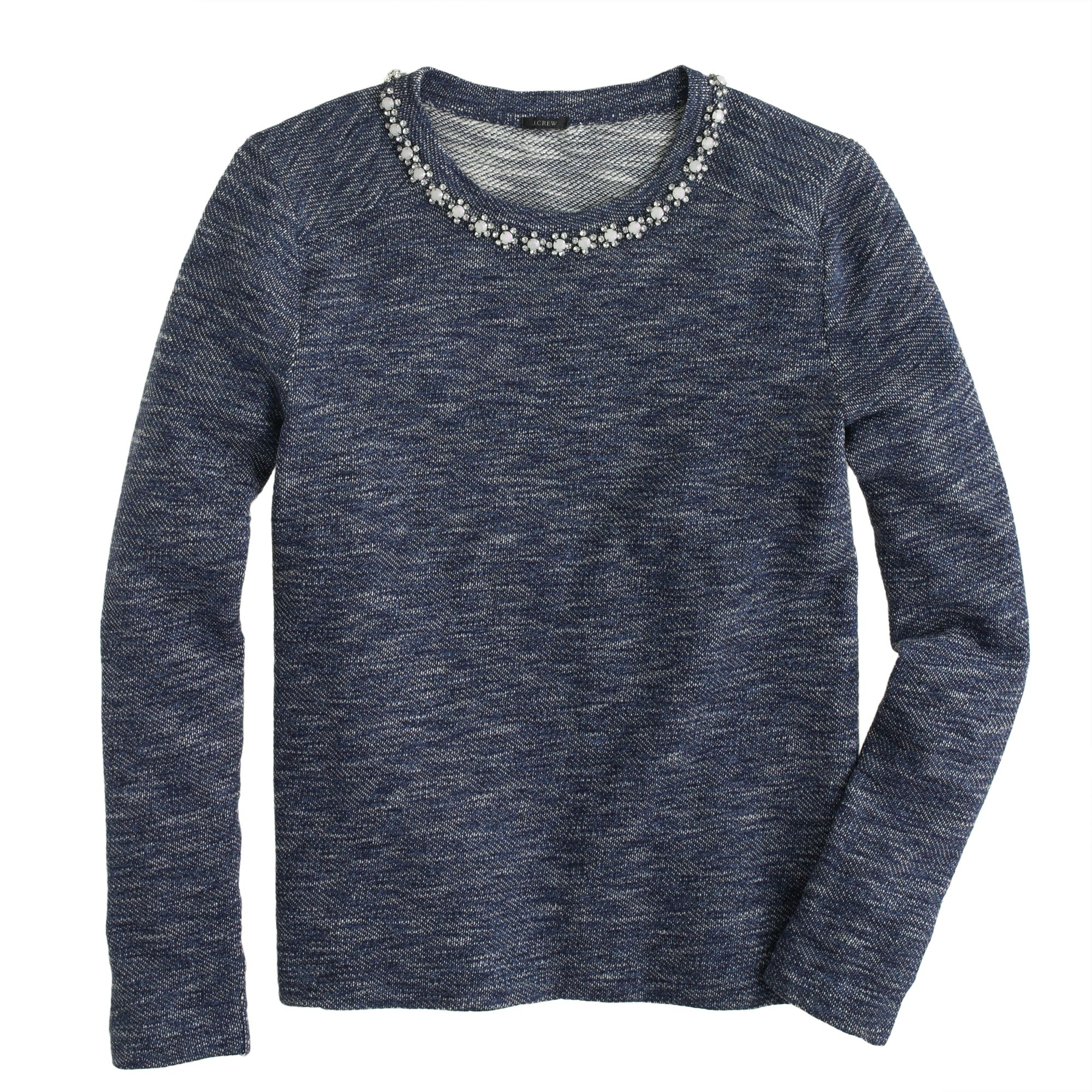 Wear it to work on a friday, then keep it on all weekend long—we can't get enough of the fancy sweatshirt. This one features hand-applied jewels around the neckline and a supersoft heathery terry fabric we developed based off a japanese thrift-shop find. Slightly loose fit. Body length: 24 3/4". Cotton. Machine wash. Colour: blue