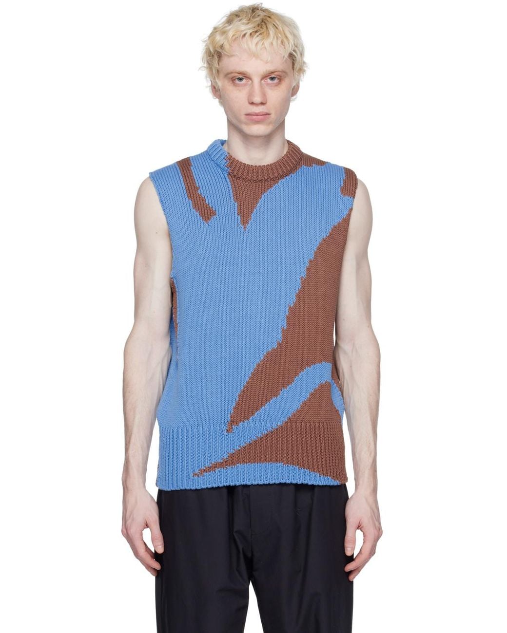 Knit lightweight cotton vest. Intarsia graphic pattern throughout. · Rib knit crewneck and hem · Rolled edge at armscyes Supplier color: Open brown