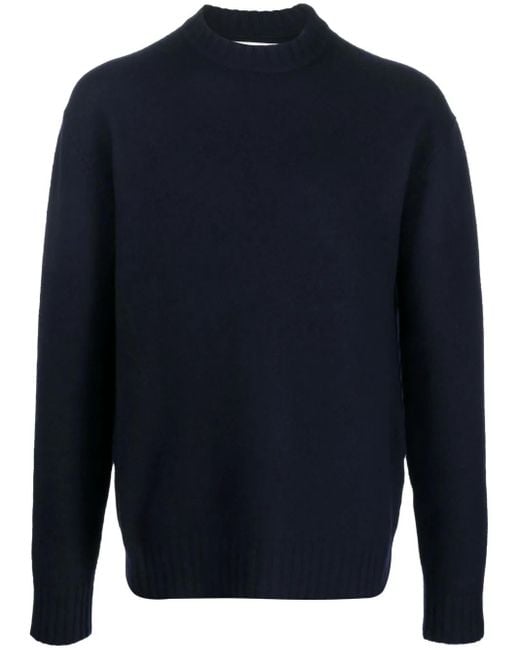 Crew-neck pullover jumper from JIL SANDER featuring navy blue, wool, knitted construction, crew neck, long sleeves, straight hem and ribbed trim. Size: 46. Gender: Male. Material:Wool.