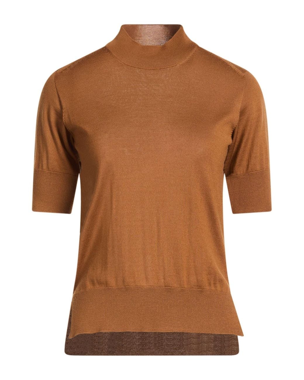 JIL SANDER. knitted, lightweight knit, no appliqués, plain colour, mock neck, short sleeves, side slit hemline, dry clean, do not bleach, do not tumble dry, power dressing meets elegance in this chic office outfit that will inspire confidence every day. 35% Cashmere, 35% Virgin Wool, 30% Silk.
