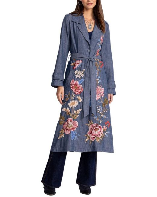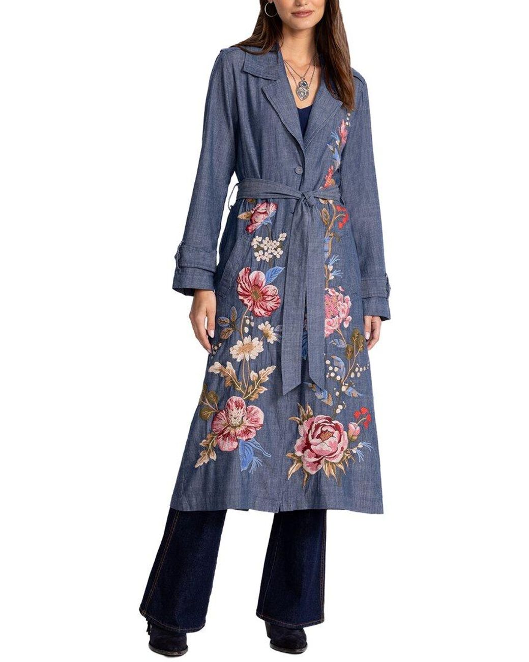 About the brand: Eclectic, Boho vibes with a vintage flare. Coat in denim blue Approximately 48.5in from shoulder to hem Measurements taken from a size small and may vary slightly by size. Design details: Notched collar, welt slip pockets Button front 100% cotton Machine wash cold Imported