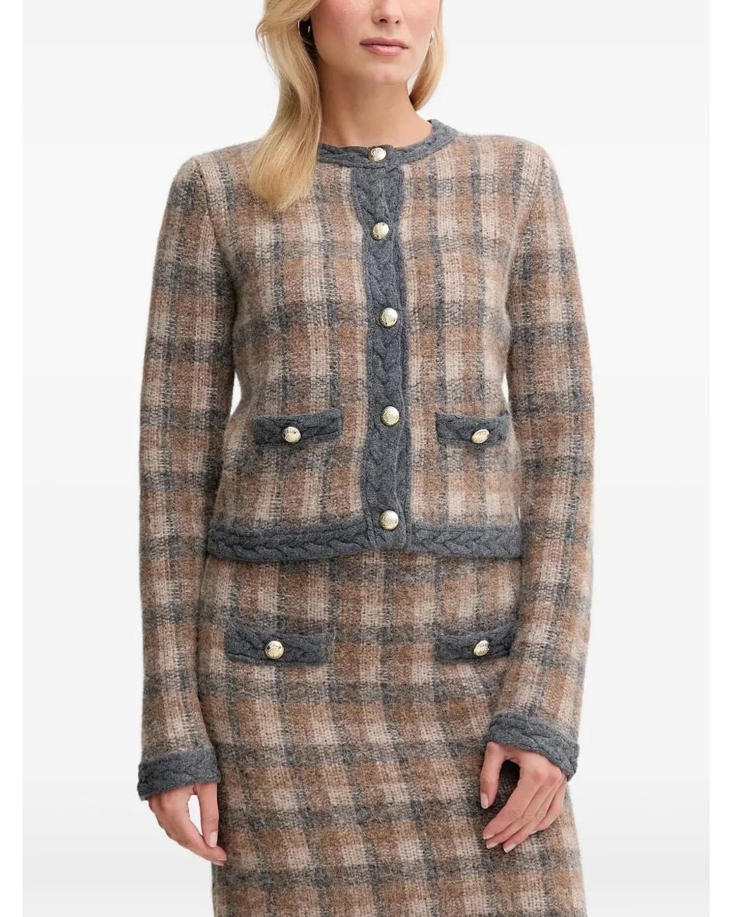 Beige check pattern round neck front button fastening cable knit trim front pockets Size: 34. Gender: Female. Material:Wool/Alpaca Wool/Nylon/Elastane. Colour: grey