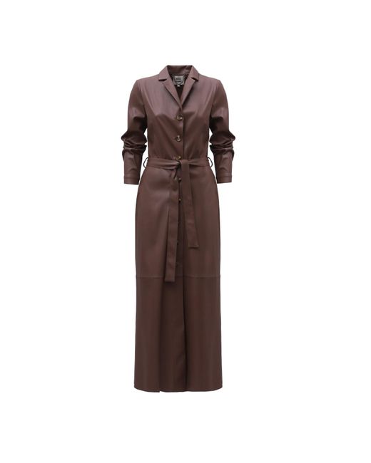 This coat is made of faux leather fabric with lapel collar. Leather Trench is equipped with hidden in seam side pockets and tied self belt in same fabric. Long sleeves with buttoned cuffs and front button closure make this an understated piece that has emphasis on both style and comfort. The product can be worn as a dress or as a coat. Made in Moldova Artisanal Vegan Care: dry cleaning Colour: brown