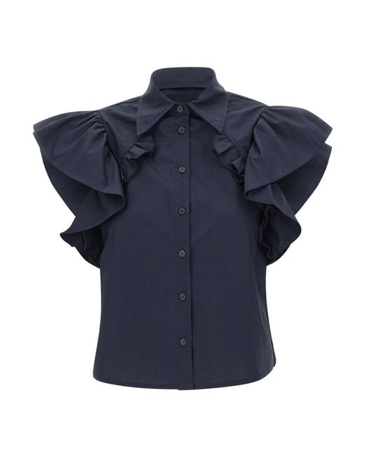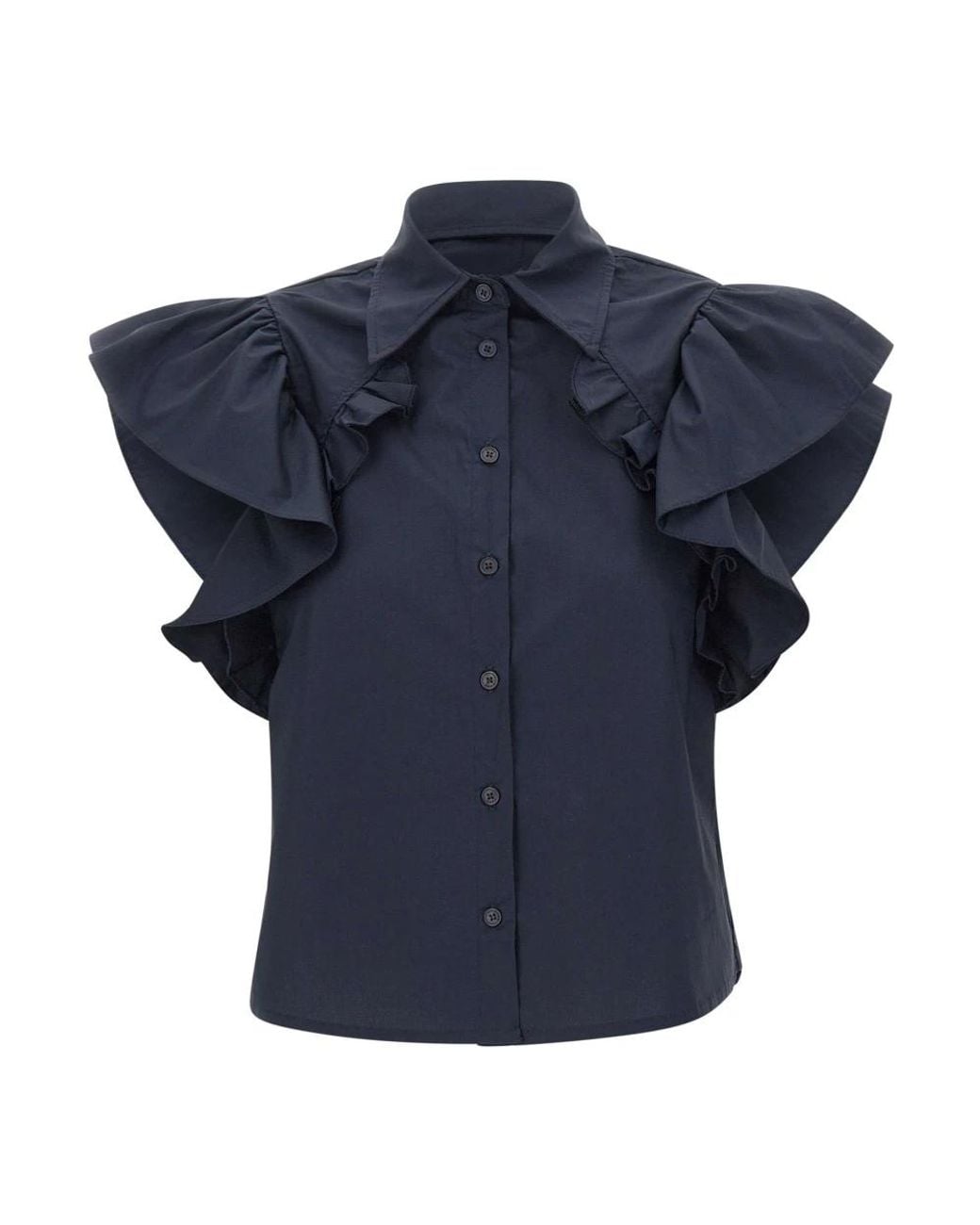 Kaos cropped shirt with a contemporary feminine line, crafted from navy blue cotton and defined by flounced wide short sleeves and a ruffle-front detail for added movement. Key attributes: Navy blue | Cotton | Tonal button closure | Cropped cut | Pointed collar | Wide short sleeves with flounces | Front ruffle detail | Dimensions & fit: Regular fit | Cropped cut | Composition & care: Cotton Colour: blue