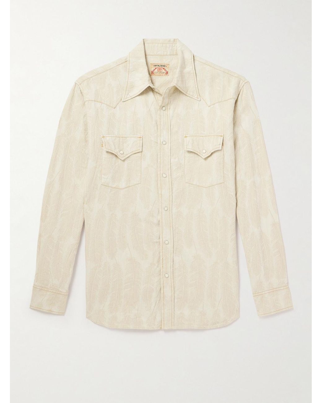 Men's Natural Magpie Distressed Denim-Jacquard Western Shirt
