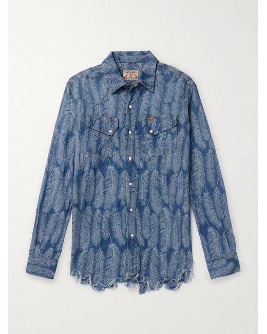 Men's Blue Magpie Distressed Denim-Jacquard Western Shirt