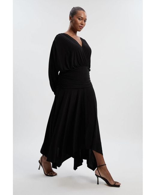 Women's Black Plus Size Stretch Drapey Crepe Ruched Plunge Neck Batwing Sleeve Maxi Dress
