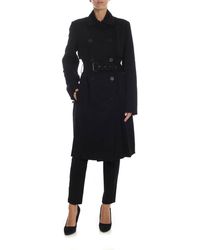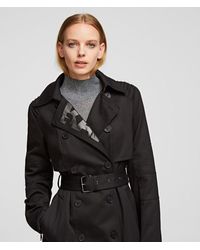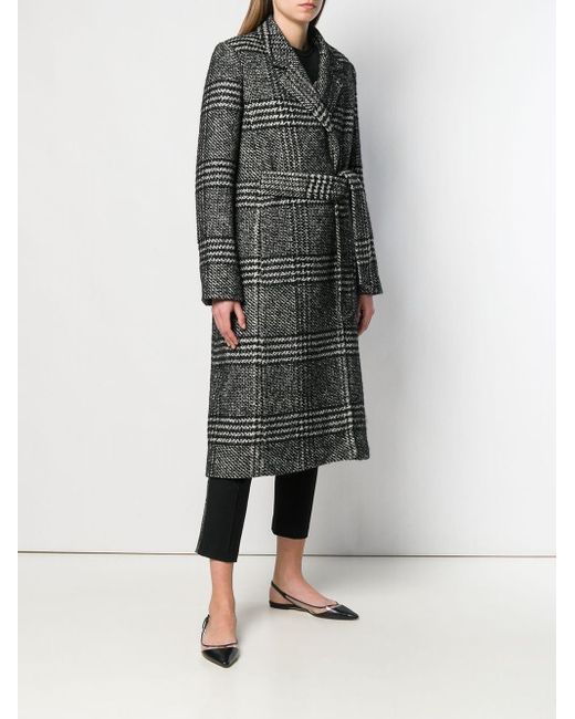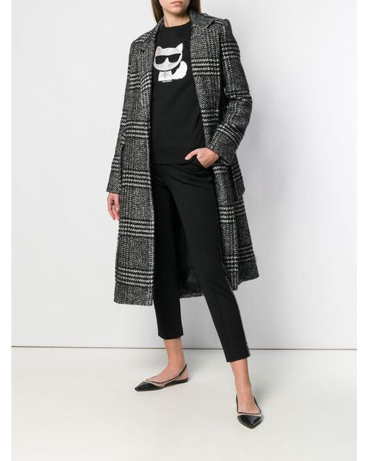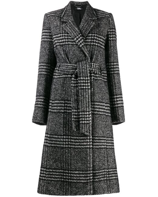 Black and white wool blend tailored check coat from Karl Lagerfeld featuring a check pattern, a straight hem, classic lapels, long sleeves and a belted waist. Material:other fibers/Cotton/Polyester/Alpaca. Colour: black