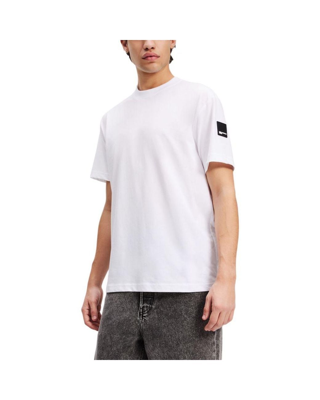 The KARL LAGERFELD KLJ REG RUBBER PATCH TEE for men (model A3M17003) is an essential piece with a modern and refined design. Crafted from 100% pure cotton, it offers all-day comfort and breathability. The regular fit cut ensures a comfortable and versatile wear, perfect for any occasion, from leisure time to casual chic outfits. The stand-out feature is the rubber logo patch on the sleeve, adding a touch of contemporary and recognizable style. Clean lines and meticulous stitching complete this t-shirt, ideal for those seeking quality and character in their wardrobe. Season: FW25. Colour: white