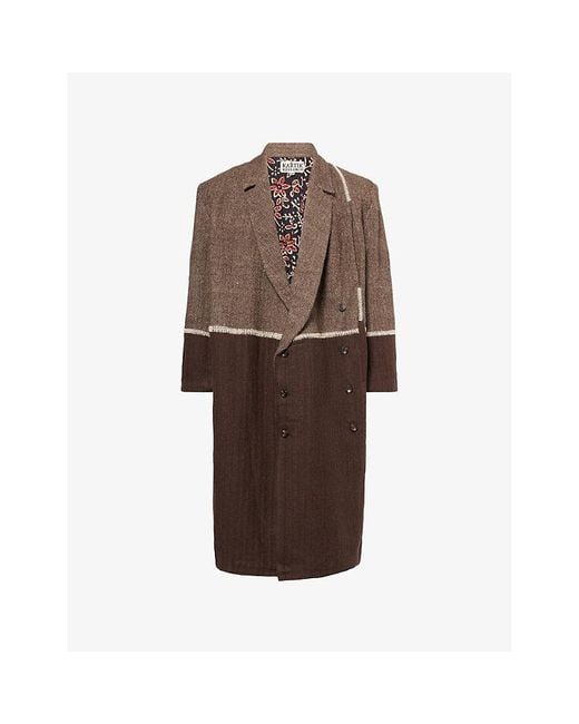 Kartik Research wool coat100% woolButton fasteningRegular fit, double-breasted, notched lapels, long sleeves, slip pockets at front, contrast stitching, brushed textureDry clean onlyMade in IndiaModel is 6ft 2in/1.88m and wears a size mediumMidweight, non-stretch Colour: brown