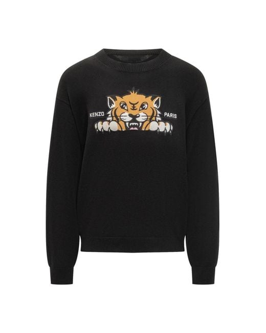 Kenzo Happy Tiger Embroidered Jumper presents the brand’s signature tiger motif with 'Kenzo Paris' lettering on a wool-cotton knit. Ideal for elevated casual wear, it pairs graphic branding with a soft merino-wool blend. Key attributes: Black | Wool | Merino wool and cotton blend | Round neck | Embroidered tiger motif at front | 'Kenzo Paris' embroidery at upper back | Dimensions & fit: Classic fit | Model is 185 cm tall and wearing size M | Composition & care: 55% wool | 45% cotton | Do not bleach. Mild professional dry-cleaning in hydrocarbons. Iron at low temperature. Flat drying in the shade. Do not tumble dry. 30°C very mild fine wash. Very mild professional wet-cleaning. Colour: black