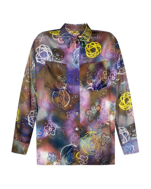 Purple abstract atom pattern floral print patch pockets button fastening long sleeves Size: 36. Gender: Female. Material:Silk. Colour: blue