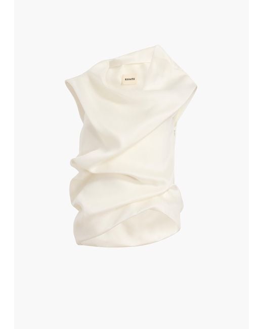 An airy, cowl-necked top in which hand-tacked silk gazar twists and turns about the body. Fully lined in silk organza. Concealed zipper closure. Colour: white