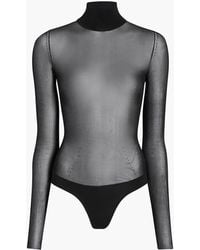 Go to FARFETCHBordeaux red stretch-design semi-sheer construction snap-fit fastening high neck long sleeves Just a reminder that this piece must be tried on over your own garments. Size: S. Gender: Female. Material:Polyamide/Viscose/Elastane. Colour: red