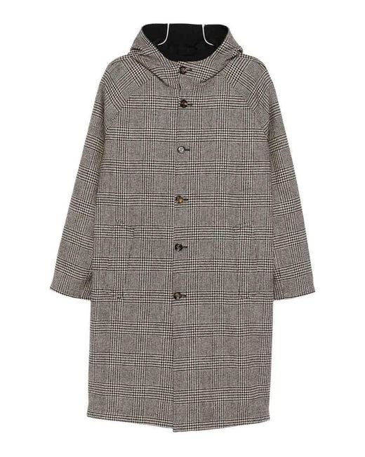 Brown, houndstooth check pattern, hooded collar, button closure, raglan sleeves, welt pockets Colour: grey