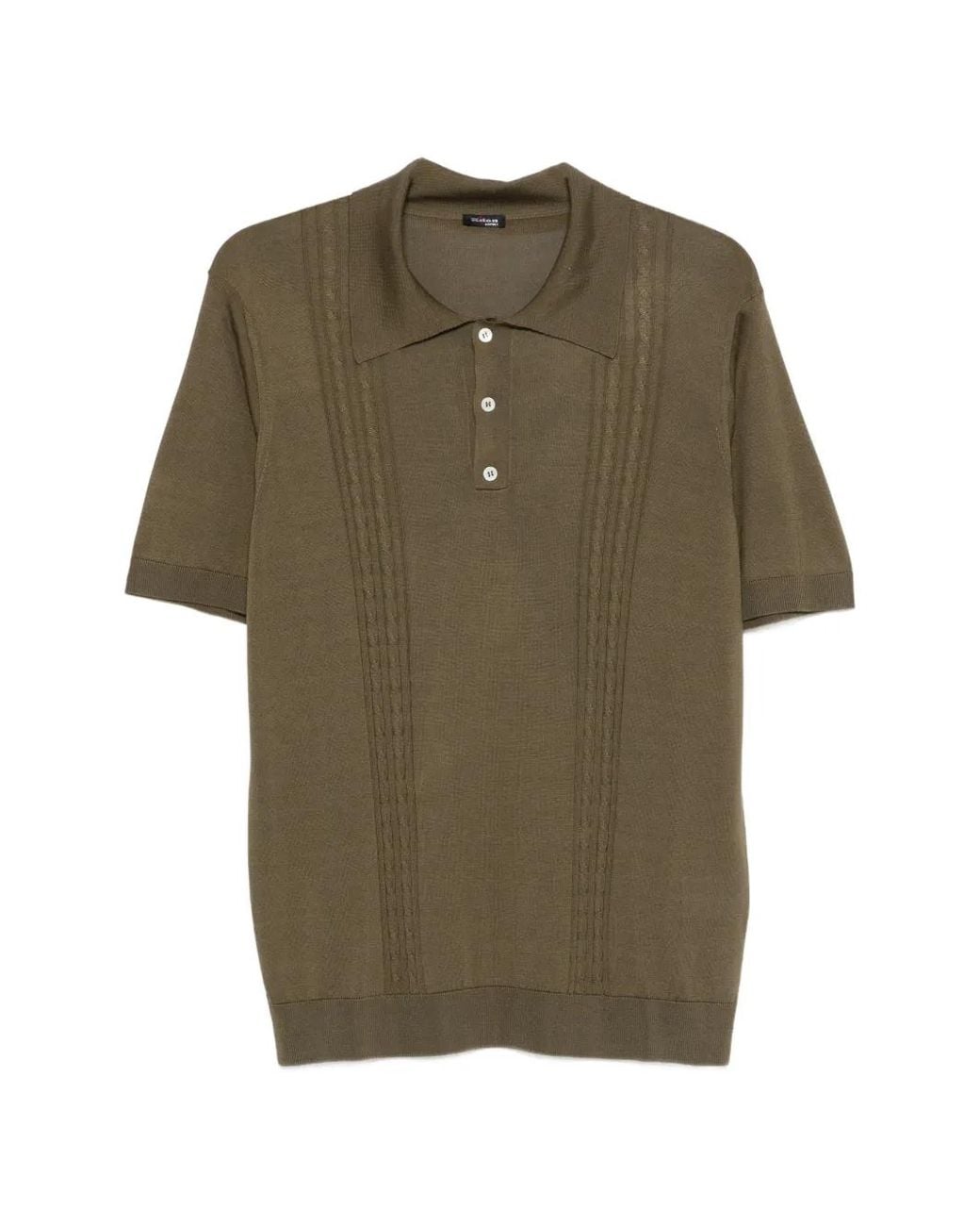 Green button fastening knitted construction point collar short sleeves textured detailing Size: M. Gender: Male. Material:Silk.
