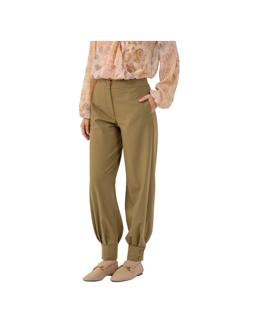 Kocca Casual tapered full length trousers combine a relaxed silhouette with a tapered leg and ankle-cuff detailing. Designed for everyday wear, they stand out for their colour-coded button accents and practical side pockets. Key attributes: Green | Verde olio | Integrated side pockets | Colour-coded waist button fastener | Tapered leg | Ankle cuff with two colour-coded buttons | Monocolour | Colour-coded button accents | Dimensions & fit: Relaxed fit | Full length | Tapered leg | Model is 177 cm tall and wears size S/42 Colour: natural