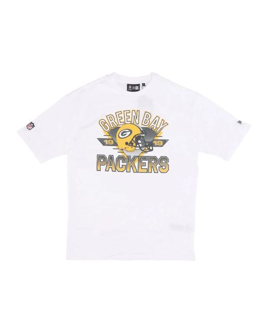 Celebrate the Green Bay Packers in style with this New Era oversized T-shirt for men. Featuring the team's logo on the front and embroidered New Era and NFL logos on the sleeves. Made of 100% cotton. Hand or machine washable. Model is 180 cm tall and wears size S. Colour: white