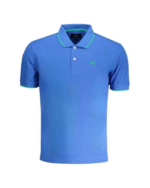 Blue contrast tipping embroidered logo polo collar front button placket short sleeves ribbed cuffs straight hem Size: S. Gender: Male. Material:Cotton.