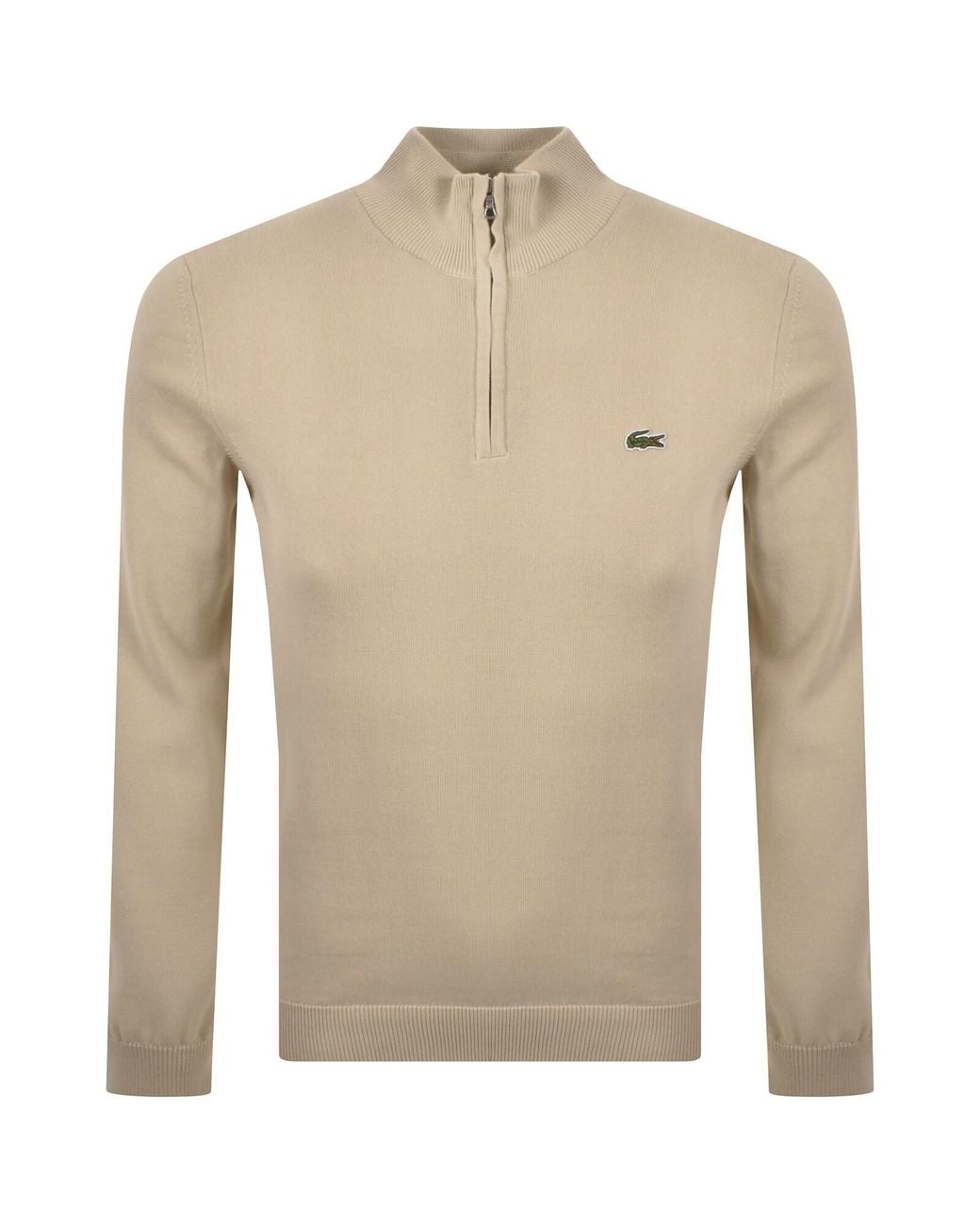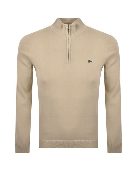 Lacoste Quarter Zip Logo Knit Jumper In Beige Regular Fit. An all over woven knit design with a branded quarter zip opening at the neck and a ribbed stand up collar. Ribbed cuffs on the long sleeves and a ribbed waistband. The Lacoste Crocodile woven logo badge is situated on the left of the chest. 100% Cotton. Colour: natural