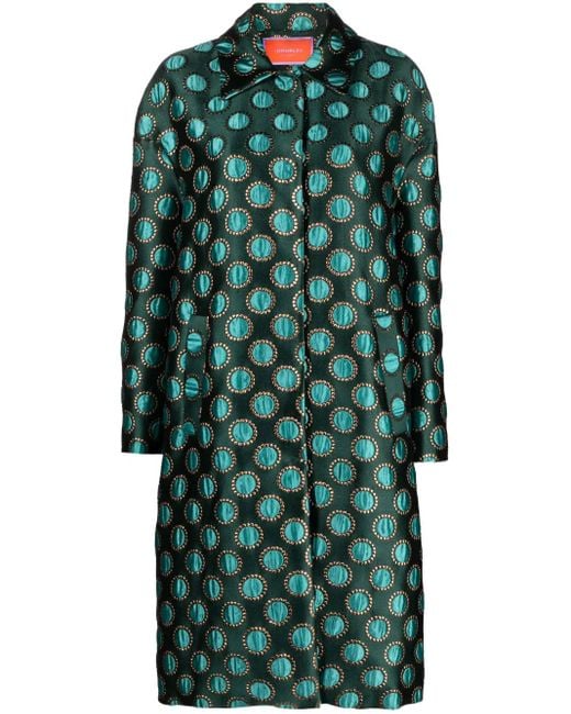 Dark green/emerald green metallic finish polka dot print classic collar concealed front fastening long sleeves straight hem mid-length Size: S. Gender: Female. Material:Polyester/Silk/Polyamide/Metallic Fibre. Colour: green
