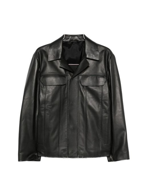 Men's Black Leather Flap-Pocket Jacket