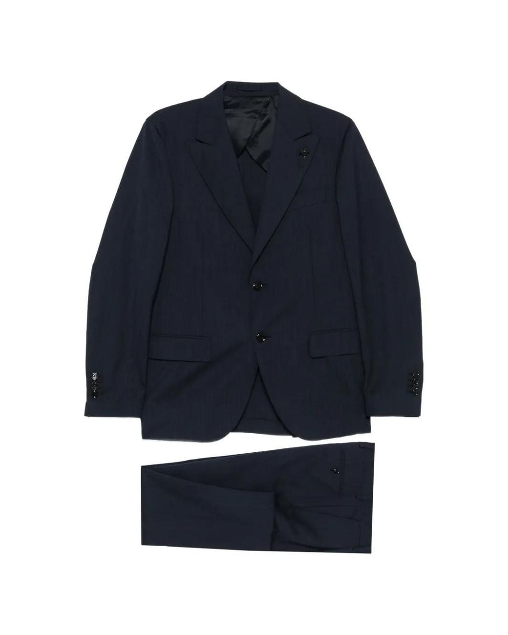 Dark blue pinstripe pattern button fastening front flap pockets notched lapels buttoned cuffs Size: 48. Gender: Male. Material:Wool/Viscose/Cupro. Colour: blue