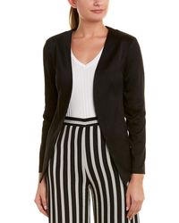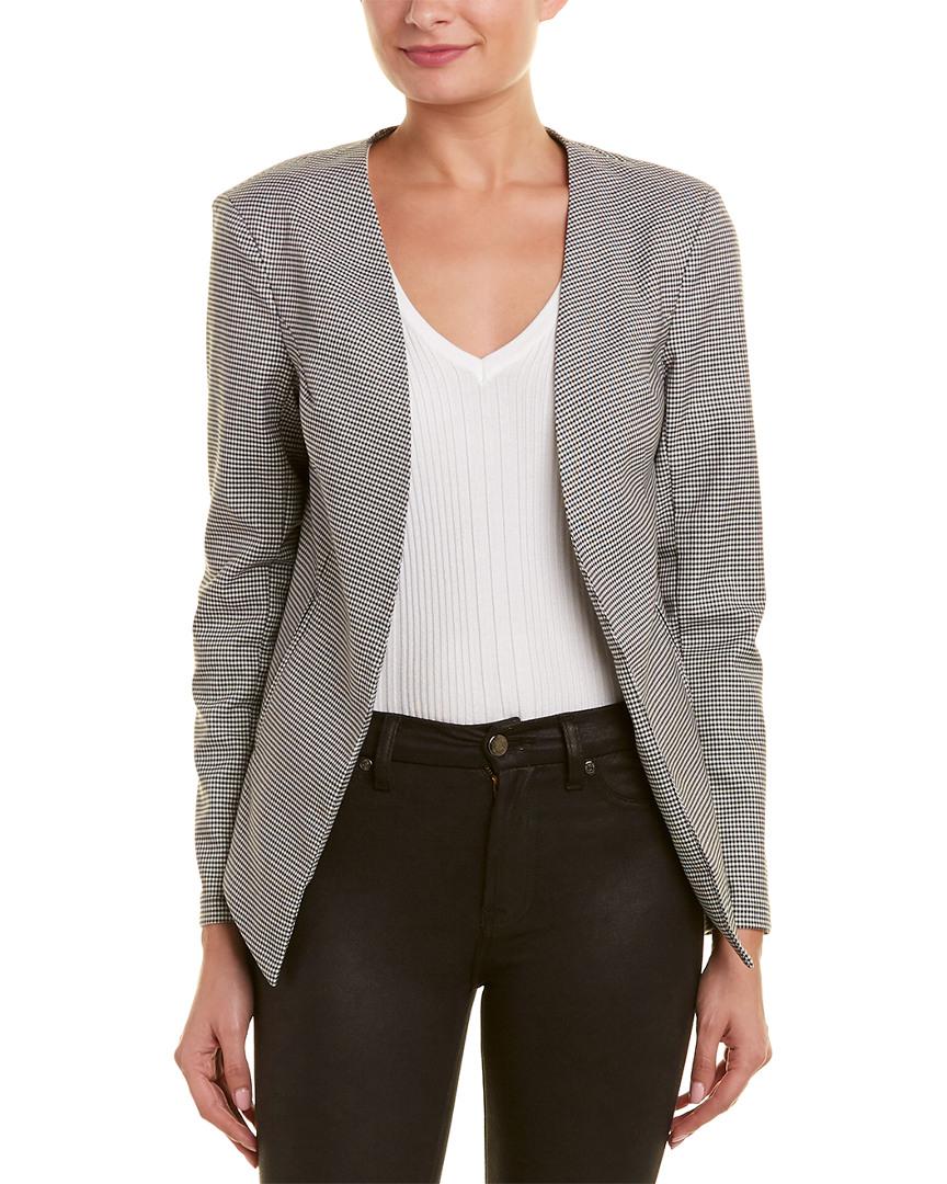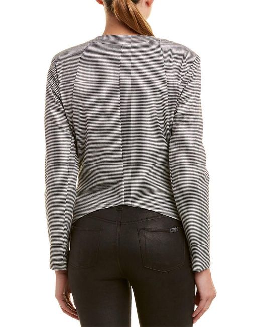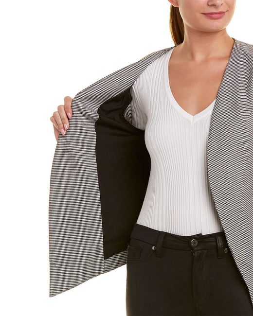 Color/pattern: black/white. Approximately 27.5in from shoulder to hem. Measurement was taken from a size small and may vary slightly by size. Design details: draped front, two front pockets. Open front. Body: 97% rayon, 3% spandex. Lining: 100% polyester. Dry clean only. Made in the USA.