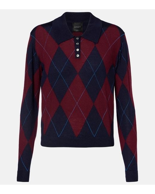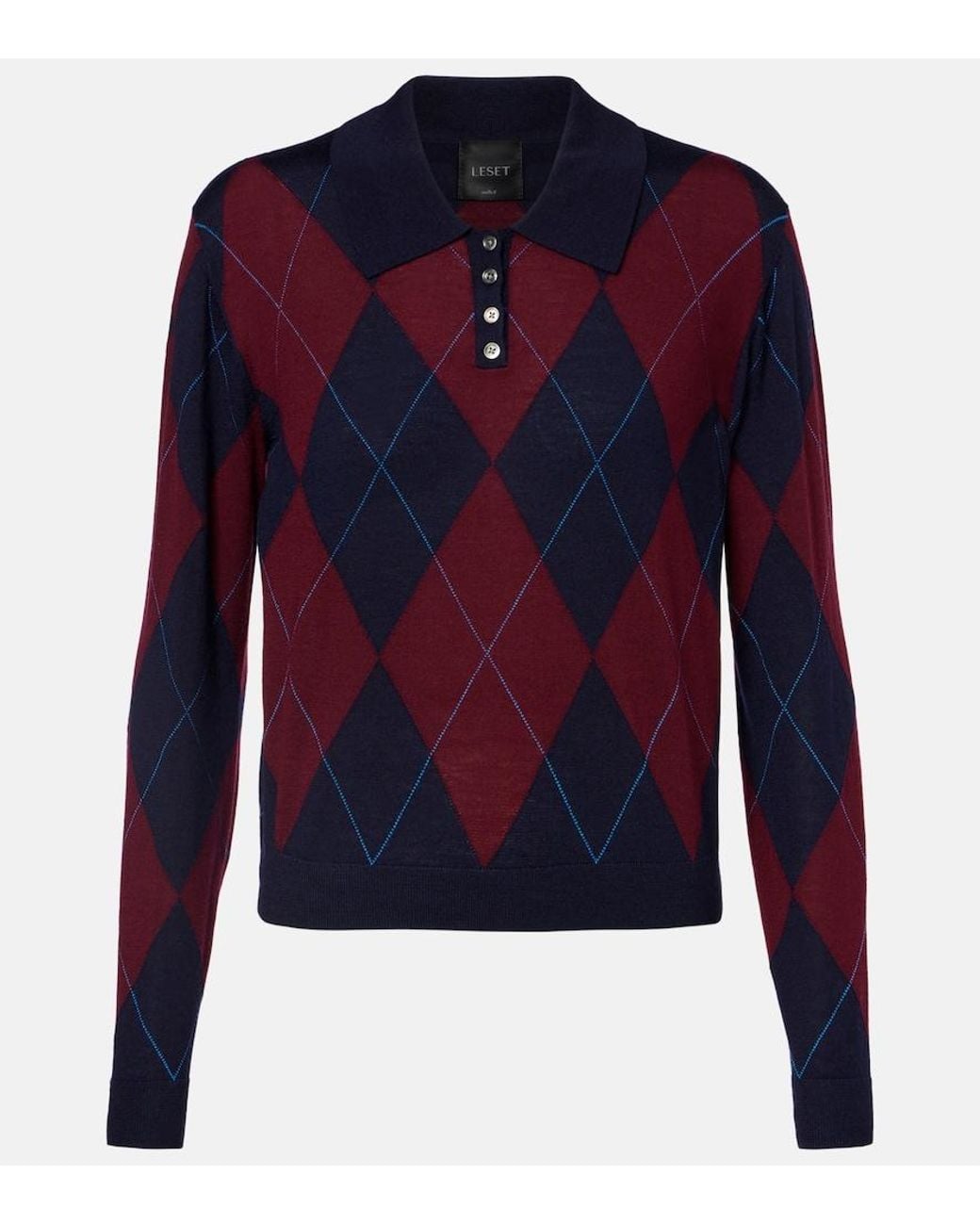Material: 100% wool (merino wool). Care instructions: dry clean. Made in China. Designer colour name: Midnight Argyle. Item color: blue, burgundy. Wool. Collar: polo collar. Cuff: ribbed. Closure: partially buttoned front. Hem: ribbed. Colour: blue