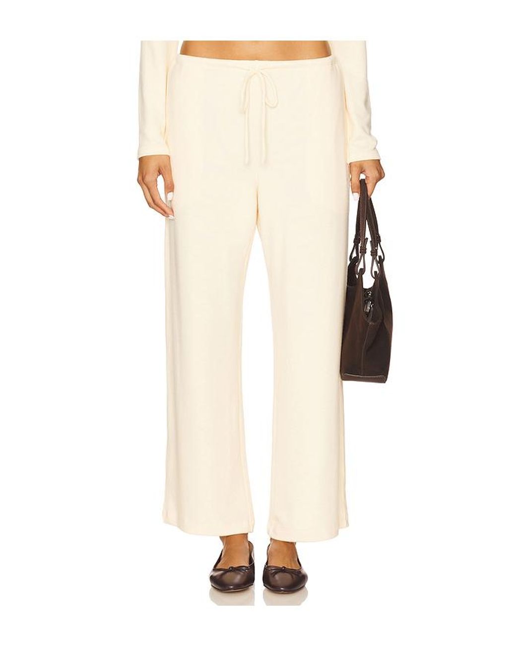 LESET Lauren Crop Drawstring Pant in Cream. Size L. Also in M. LESET Lauren Crop Drawstring Pant in Cream. Size M. 47% polyester 47% rayon 6% spandex. Hand wash. Front drawstring tie closure. Side seam pockets. Back slip pockets. Midweight soft jersey fabric. Item not sold as a set. 22 at the leg opening. LSET-WP31. LB192B-LAUREN.