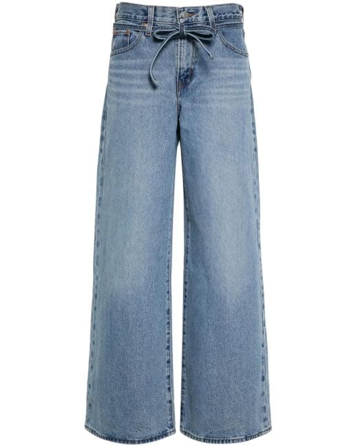 Blue cotton denim mid-wash mid-rise belted waist classic five pockets logo patch to the rear straight leg front button and zip fastening Size: 27/35. Gender: Female. Material:Cotton.