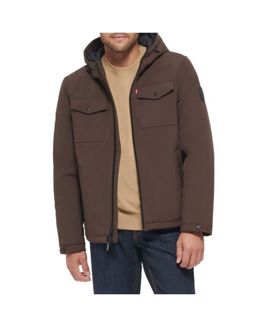 Men's Brown Soft Shell Two Pocket Sherpa Lined Hooded Trucker Jacket