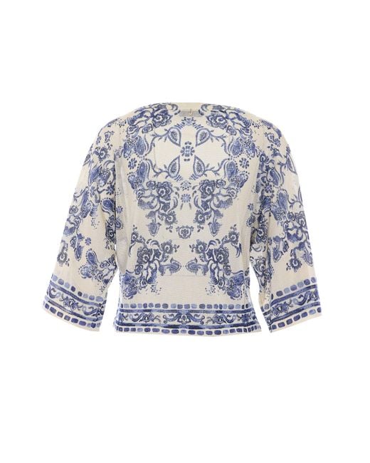 Liu Jo ivory and blue jumper, 34 sleeves, crewneck, foulard araldic print, lam effect. . Composition 91viscose,9metallized polyester Colour: blue