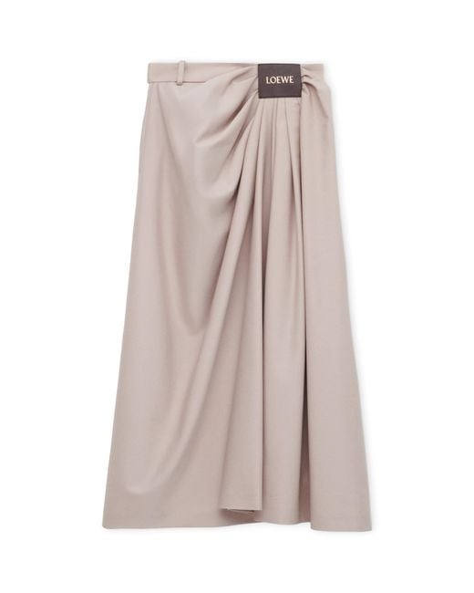 Loewe’s ability to manipulate fabrics and play with silhouette comes to life in its range of draped garments, including this midi skirt. The cotton-silk twill fabrication features voluminous pleats, then pools at the front into soft gathers that meet at a debossed leather logo patch. Colour: pink