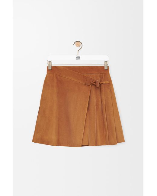 Skirt in lightweight suede lambskin featuring a wrap construction with pleats at the front and back and an Anagram engraved toggle button at the front. *Regular fit, short length *Mid waist *Concealed side button fastening *Seam pockets *Fully lined *LOEWE embossed leather patch placed at the back
