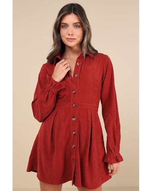Women's Red Autumn Mood Corduroy Mini Dress With Pockets