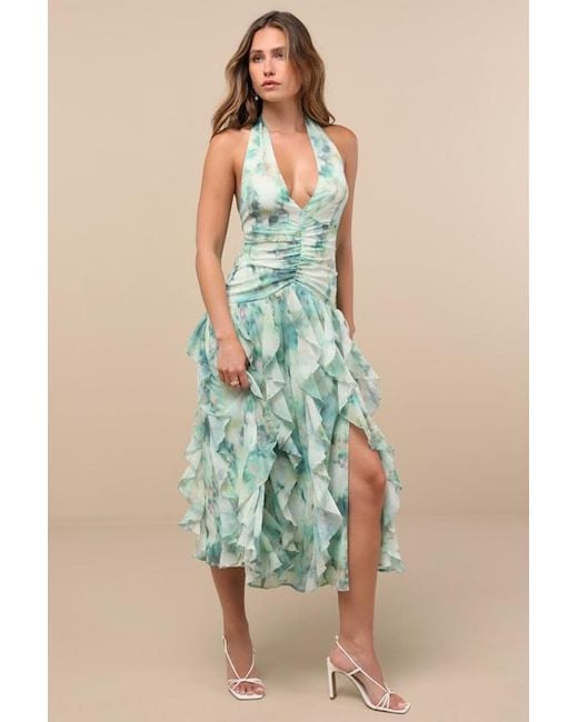 Women's Green Febe Multi Abstract Halter Ruffled Midi Dress
