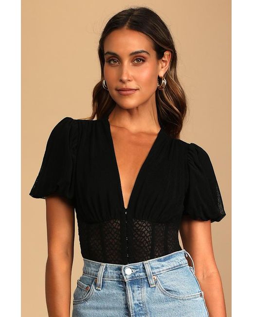 Women's Black Properly Trendy Mesh Puff Sleeve Bodysuit