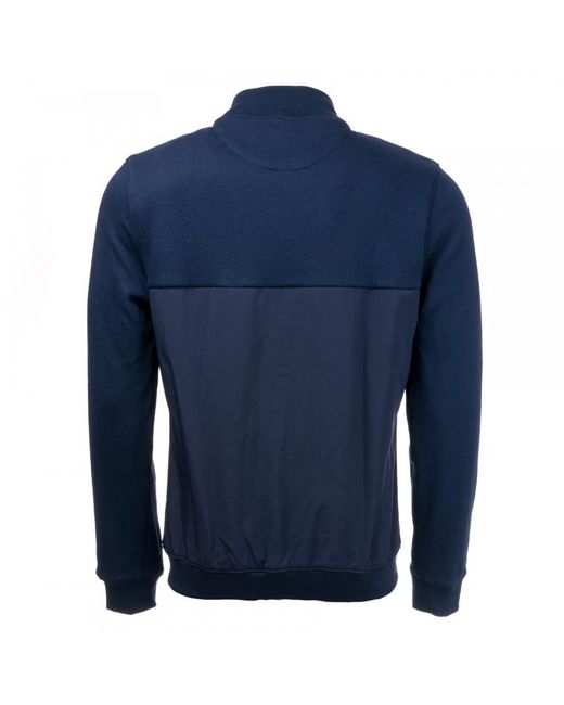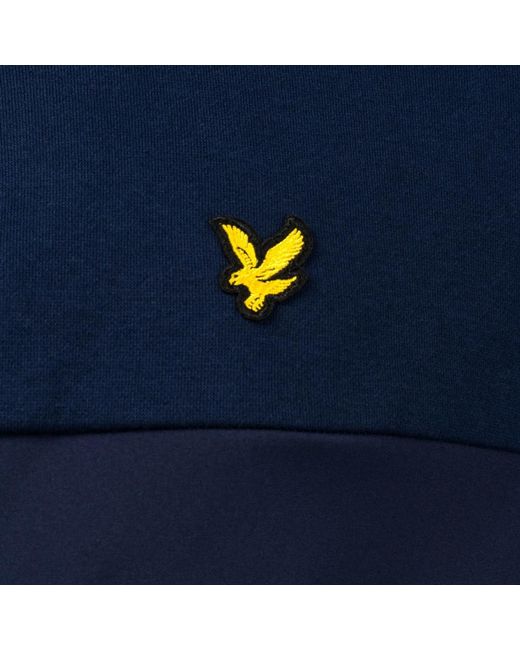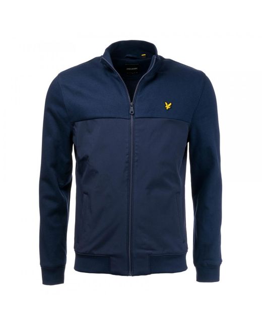 A full front zip fastening with a branded Lyle And Scott metal zipper. A ribbed jersey high collar in true black and ribbed jersey cuffs on the long sleeves and two slanted pockets at the waist. The signature embroidered Lyle and Scott Golden Eagle logo badge is situated on the left of the chest in golden yellow and black. Cotton mix lightweight loopback fabric. Contrast cotton mix fabric bottom panel. Zip through with branded puller. Rib funnel neck, hem and cuffs. Brand eagle at chest. Colour: blue