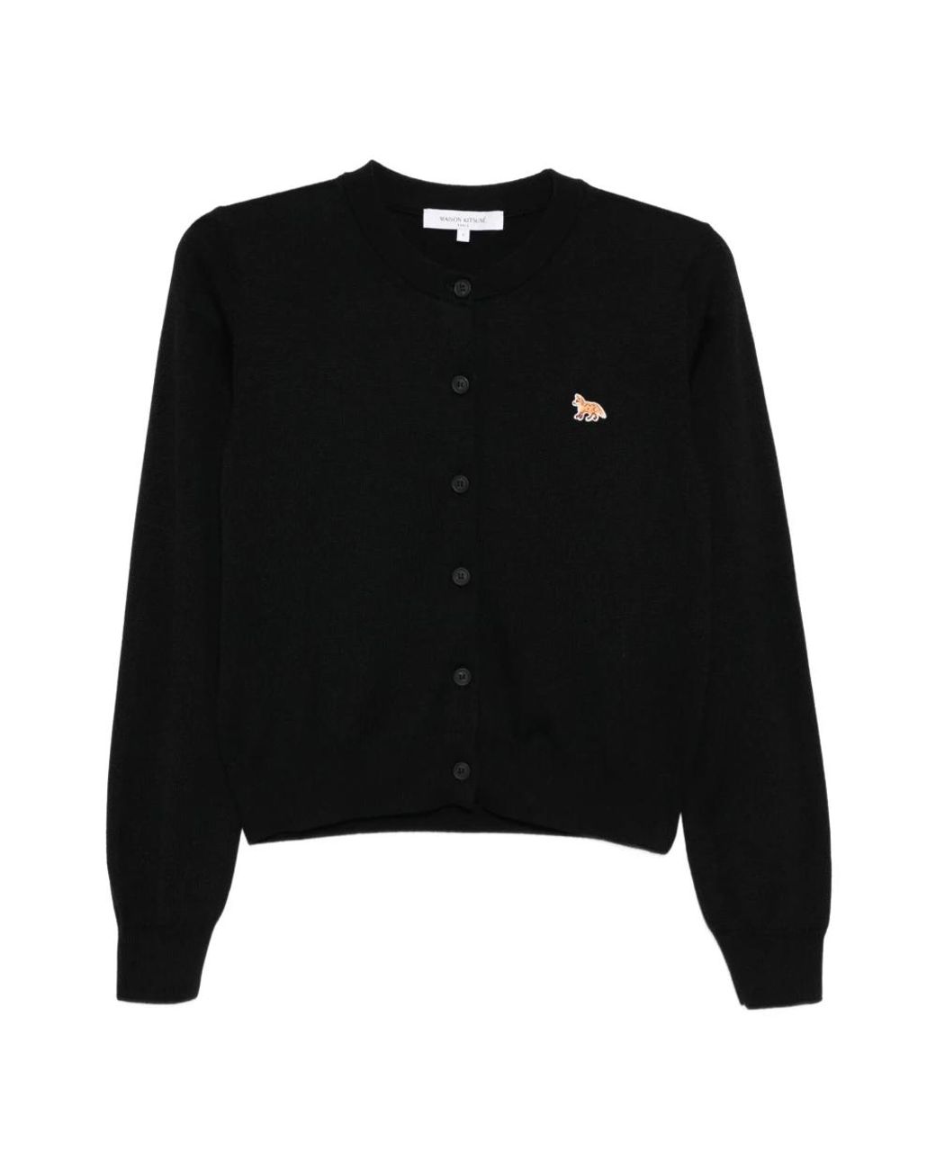 Maison Kitsuné Baby Fox Lambswool Boxy Cardigan is a wool cardigan designed for easy layering and everyday wear. It stands out for its Baby Fox embroidered patch and classic V-neck silhouette with button closure. Key attributes: Black | Lambswool | Thermoregulating knit | Soft, hypoallergenic feel | Button fastening | Two front patch pockets | V-neck | Baby Fox embroidered patch on chest | Ribbed trim at neckline, cuffs and hem | Maison Kitsuné engraved buttons | Dimensions & fit: Sleeve length (size S): 63 cm | Length (size S): 55 cm | Underarm width (size S): 52 cm | Boxy fit | Composition & care: 100% lambswool | Hand wash at ambient temperature or dry clean (mild). Do not bleach. Drip flat dry. Iron at low temperature. Colour: black