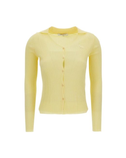 Maison Kitsuné Buttoned Cardigan is a slim-fit ribbed knit cardigan with a V-neck and embroidered chest logo. Its lightweight construction makes it ideal for layering in transitional weather. Key attributes: Yellow | Giallo | Cotton | Front button fastening | Ribbed knit | V-neck | Embroidered chest logo | Long sleeves | Dimensions & fit: Slim fit | Composition & care: Cotton 53% | Viscose 47% | Machine wash Colour: yellow